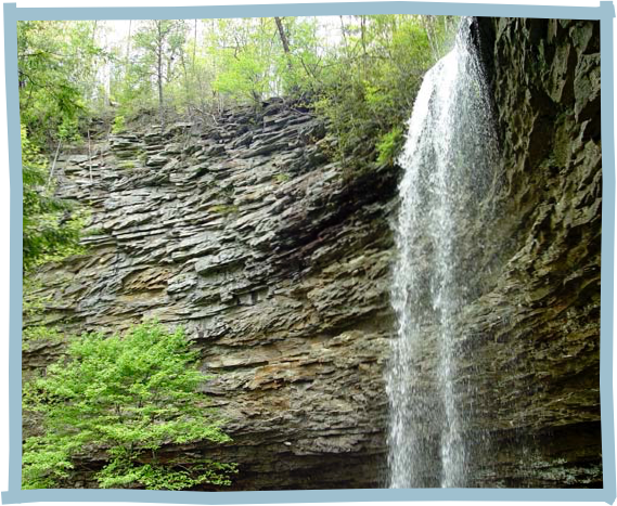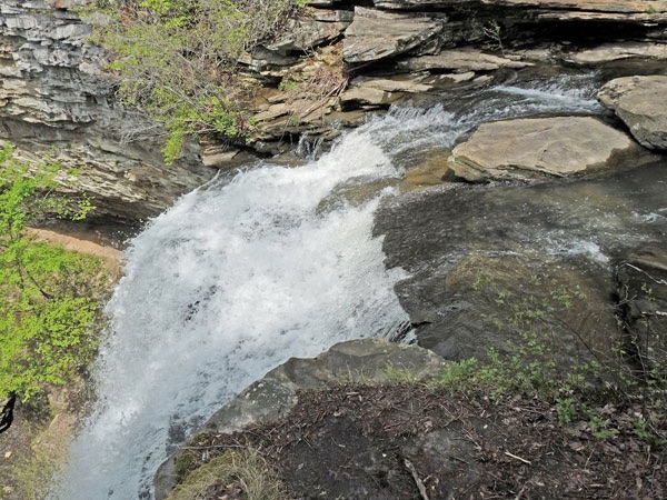 It's where the Little Piney Creek comes gently rippling down its bed, and then plunges over the edge as the ground drops out from under it.