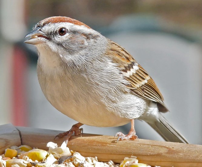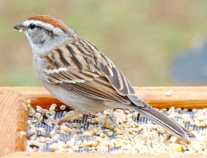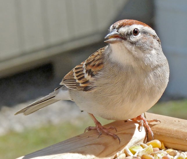 When I put a make-shift platform feeder on my back porch railing, the Chipping Sparrows were the first birds to start using it, enabling me to get these nice close-up shots which are great for being able to see the bird’s coloration.