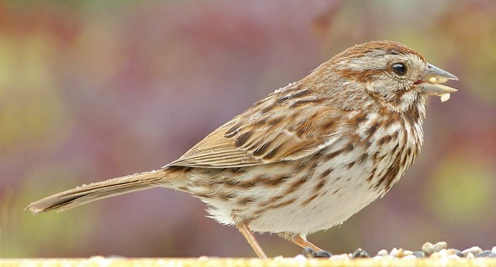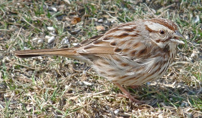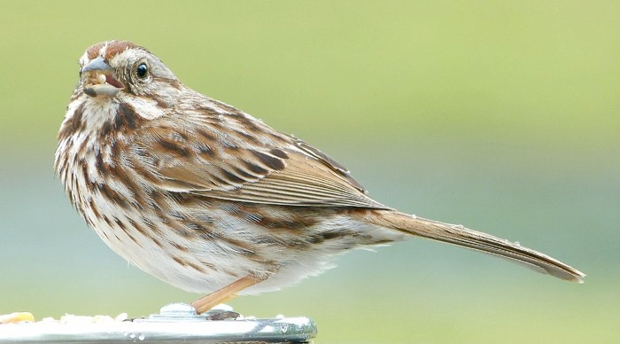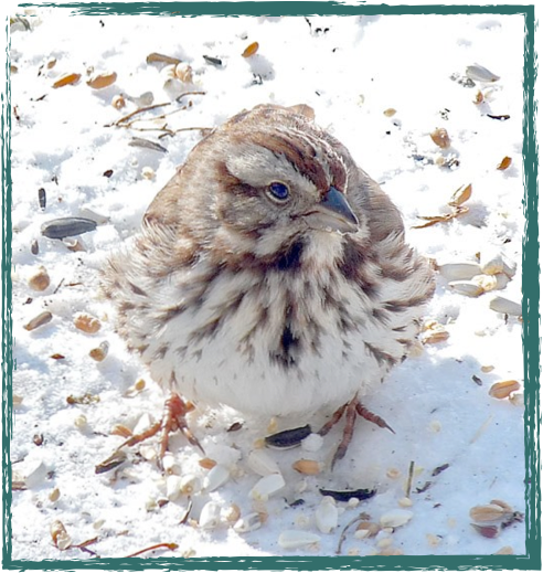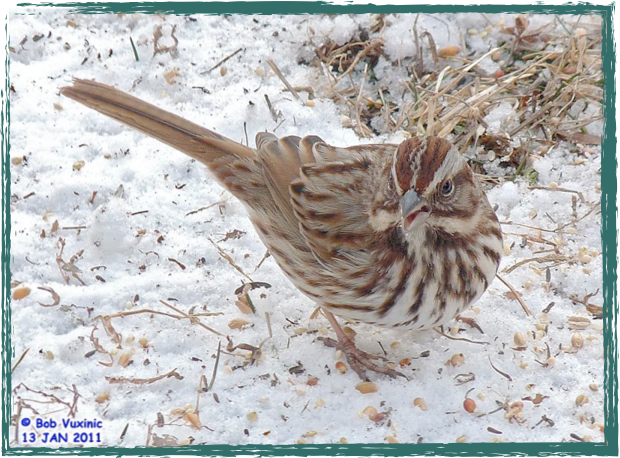 The other sparrows that visit my yard come only infrequently. This is the first of the most reliable sparrow visitors, the Song Sparrow (Melospiza melodia). As you see in these first shots, they often show up with the worst of the winter weather...if it starts to snow, I can get my camera ready for the Song Sparrows!