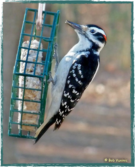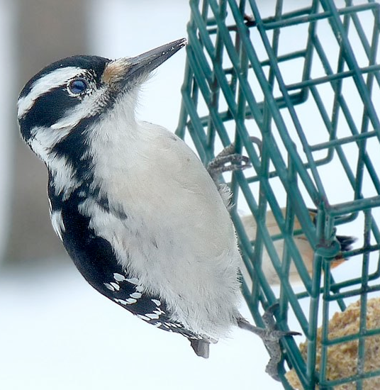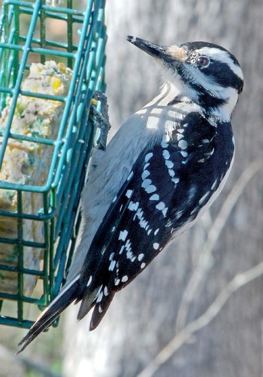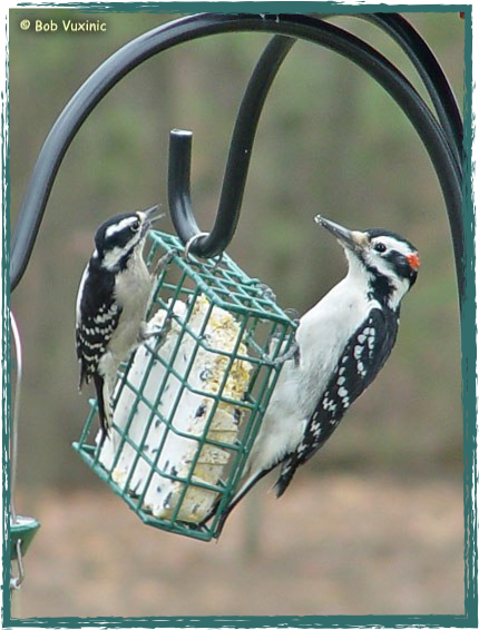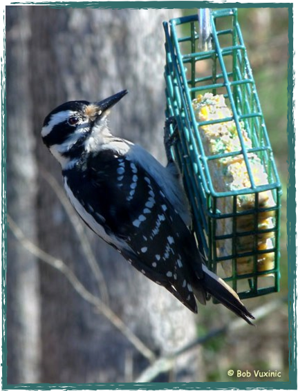 Woodpeckers and Hairy Woodpeckers look almost the same. The Hairies are larger and their bills are