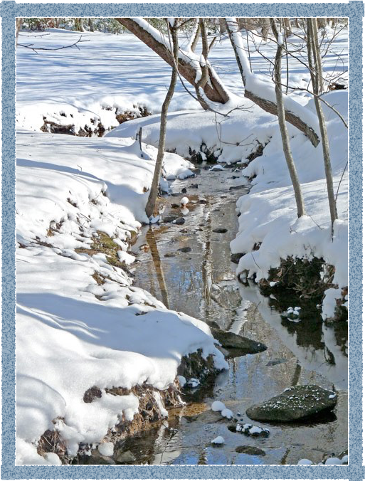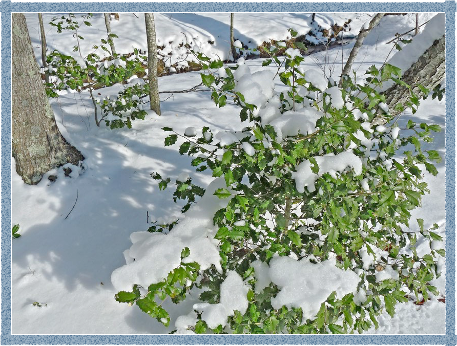 As I near the brook, I come upon a familiar symbol of the winter season – a snow-covered holly bush.